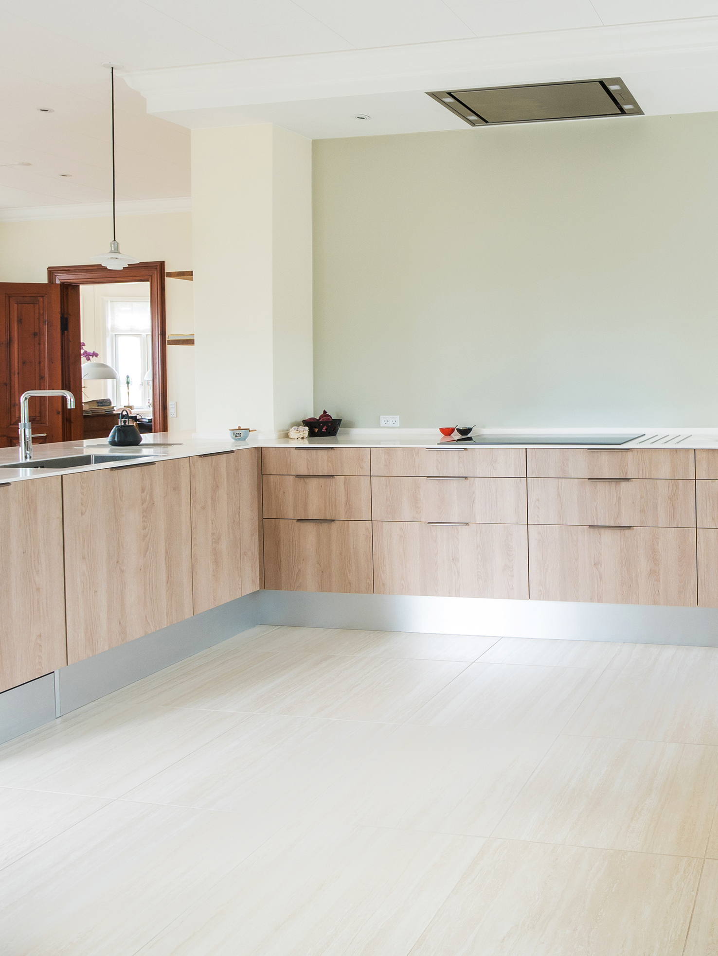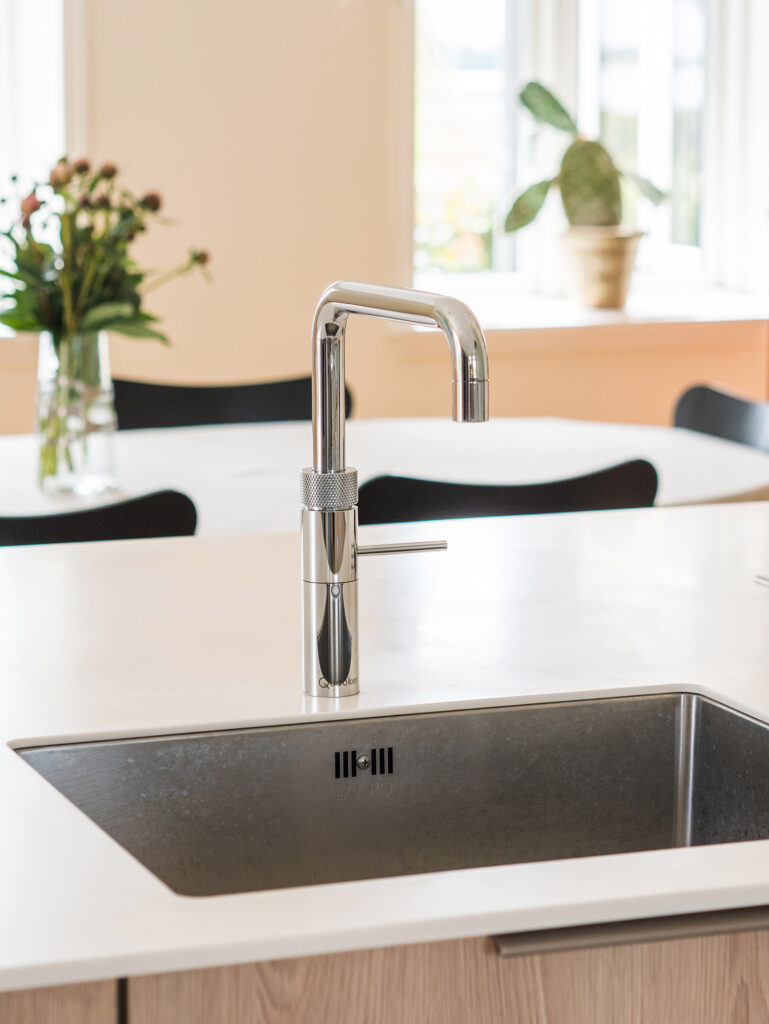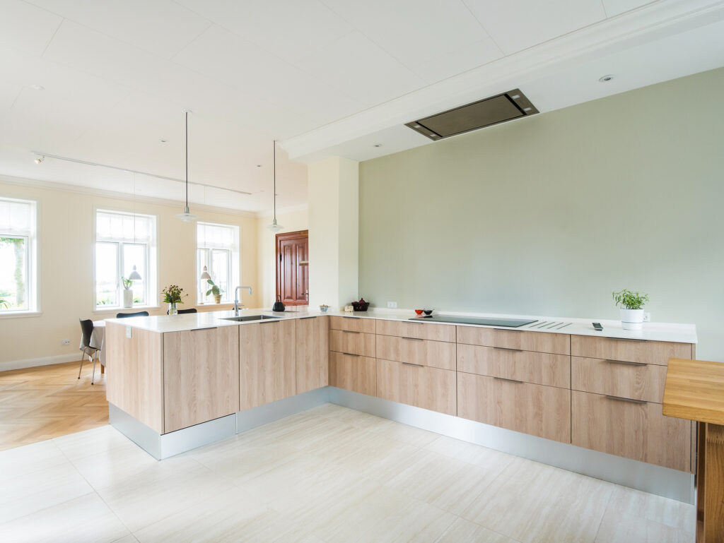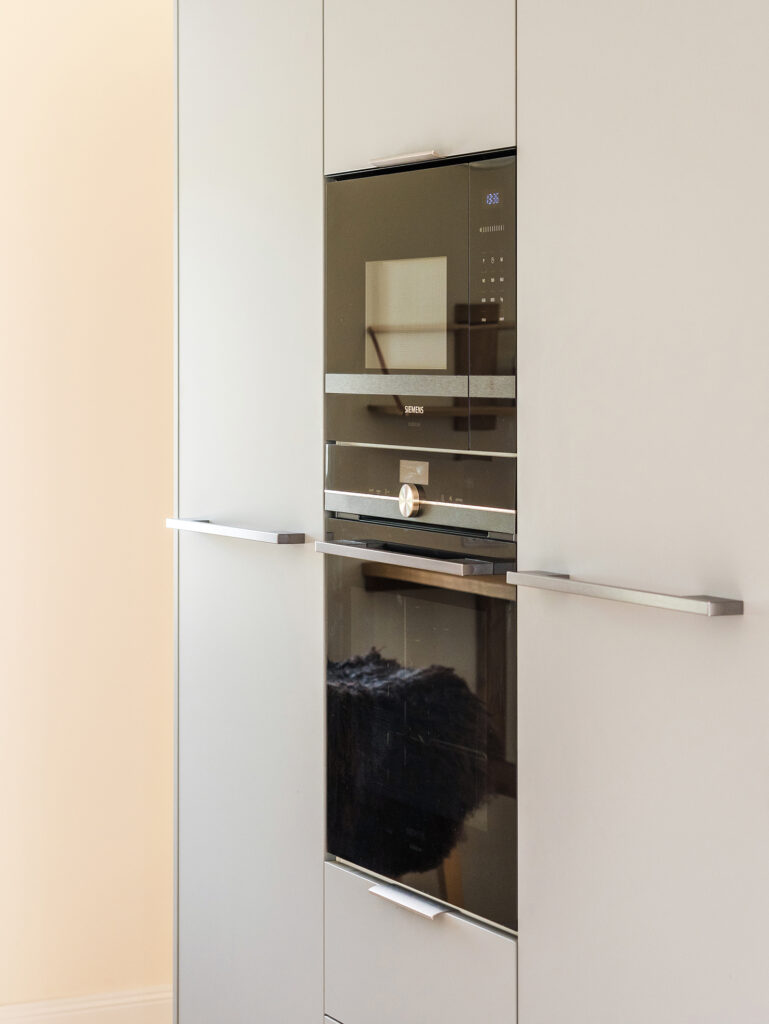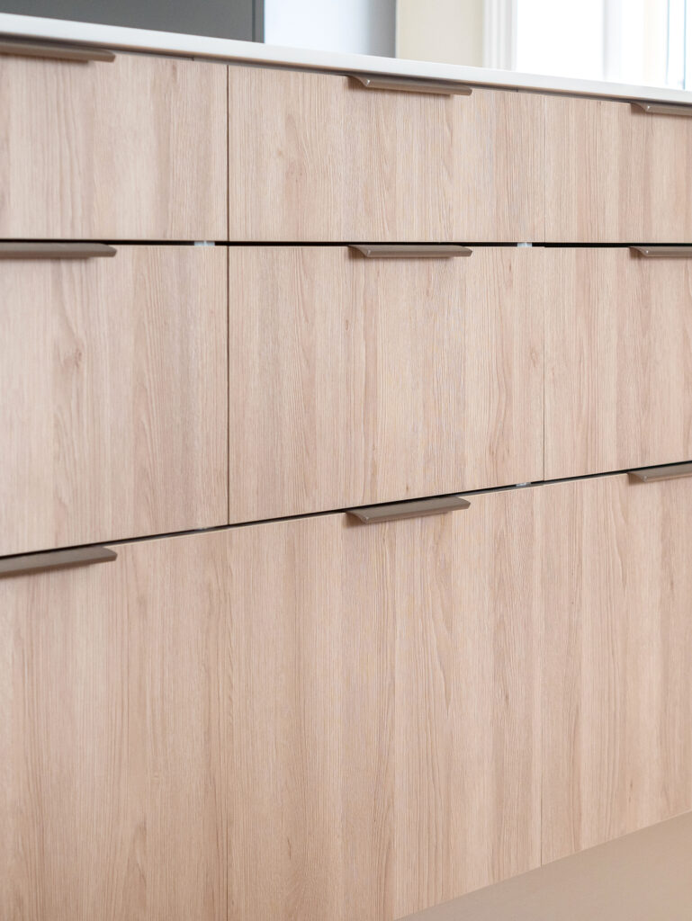 De sammensatte fronter uden synlige beslag giver et roligt og strømlinet udtryk, mens de gennemgående topgreb i stål eller aluminium – i enten en buet eller kantet form – tilfører en elegant, funktionel detalje. Det alsidige design gør det let at integrere køkkenet i skandinaviske interiør, hvor naturlige materialer, afdæmpede farver og rene linjer skaber en tidløs og rolig atmosfære.